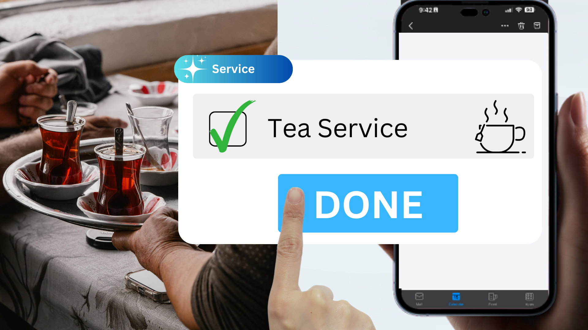 Call for tea service when making a room booking Tea service staff complete the service and confirm in Offision.